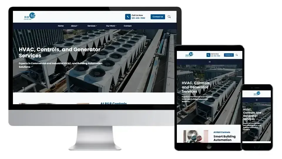 The website showcases R&R's commercial HVAC services, including HVAC Controls & Building Automation, HVAC maintenance and repairs, generator services, and more. The site includes featured HVAC projects, a gallery, and the HVAC Automation Insights blog.